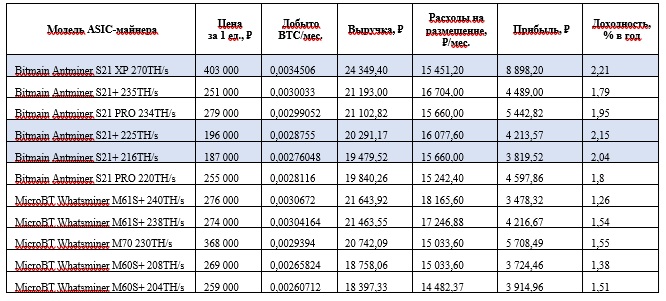 Модели MicroBT Whatsminer показали положительные, но более умеренные показатели доходности — 15,12–18,61 % годовых. Разница в долях процента месячной доходности при сопоставимых мощностях формирует значимое отличие на горизонте года.