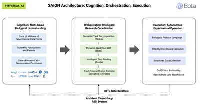 Благодаря запатентованному языку биологического протокола BOTA, SAION AI преобразует экспериментальные проекты в стандартизированные инструкции, которые напрямую управляют лабораторным оборудованием, передавая реальные данные обратно на уровень познания, что обеспечивает непрерывное улучшение модели и ускорение исследований и разработок.