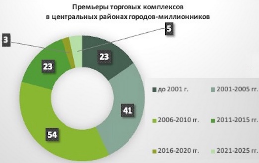 Исследование, проведенное специалистами УК «САМПА», показало, что центральные районы 16 российских городов с населением от 1 млн человек суммарно включают 149 торговых комплексов разного масштаба (общая площадь – 5,1 млн кв. м, арендопригодная – 3,0 млн кв. м). В Москве сеть таких объектов насчитывает 33 адреса, в Санкт-Петербурге – 26, в Екатеринбурге – 19, в Нижнем Новгороде – 14, в Перми – 10, в остальных мегаполисах – менее 10.